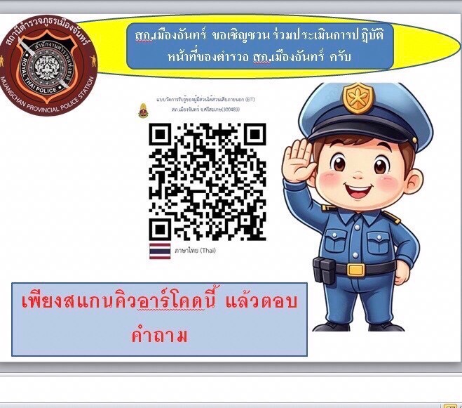 - เชิญชวน ประชาชนทั่วไป ร่วมประเมินการปฏิบัติหน้าที่ของข้าราชการตำรวจ สถานีตำรวจภูธรเมืองจันทร์ จ.ศรีสะเกษ เพียงสแกนคิวอาร์โคดนี้ แล้วตอบคำถาม แล้วกดส่งแบบประเมิน